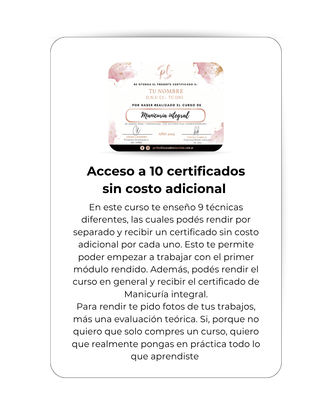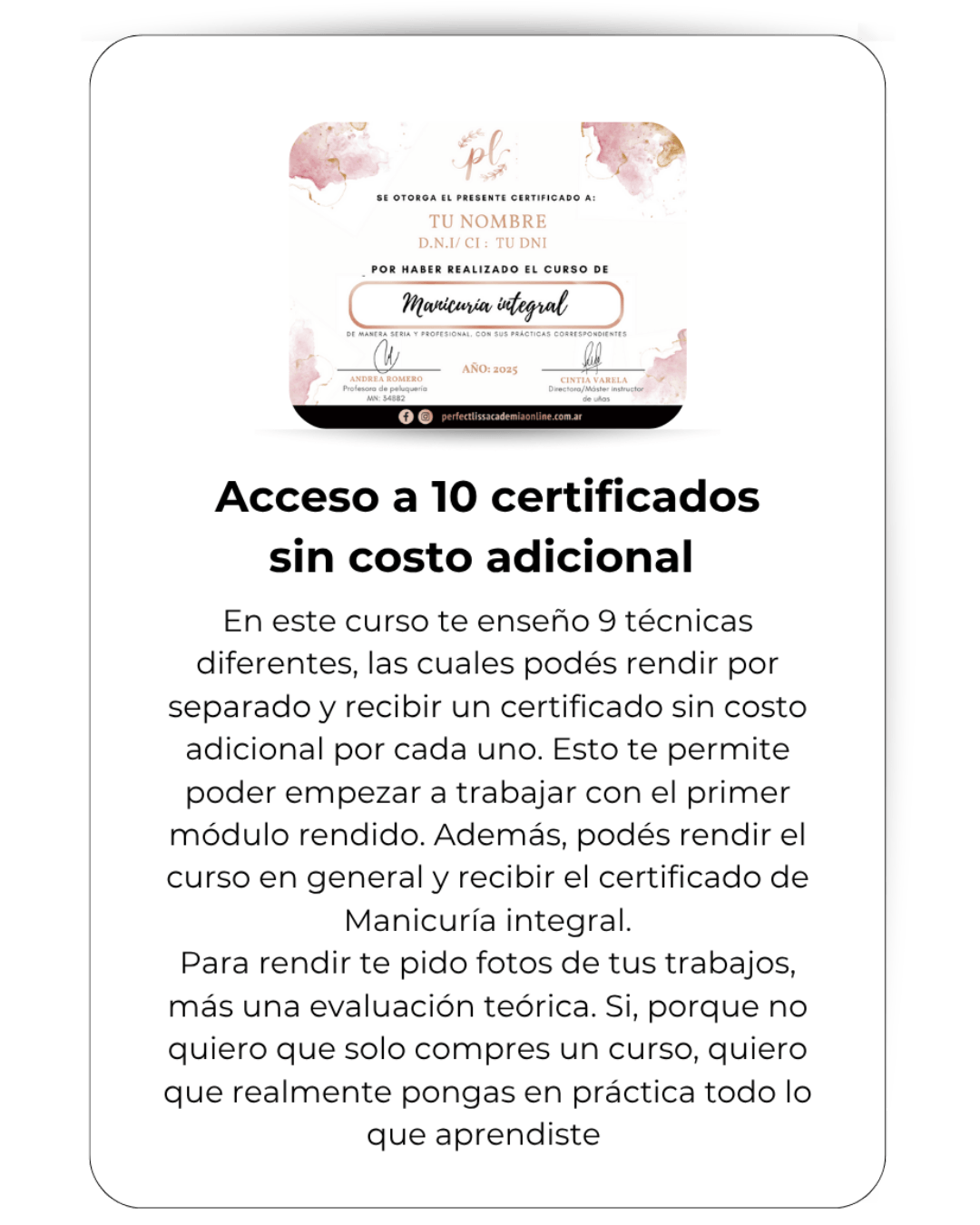 Con esta formación podés rendir cada técnica por serpado y recibir un certificado individual por cada una y también podés rendir el curso en general y recibir el certificado de Manicuría integral. Tendiendo así, la posibilidad de recibir 10 certificados en total.