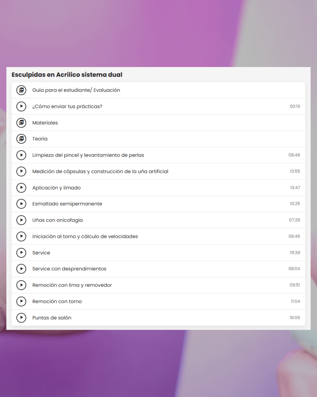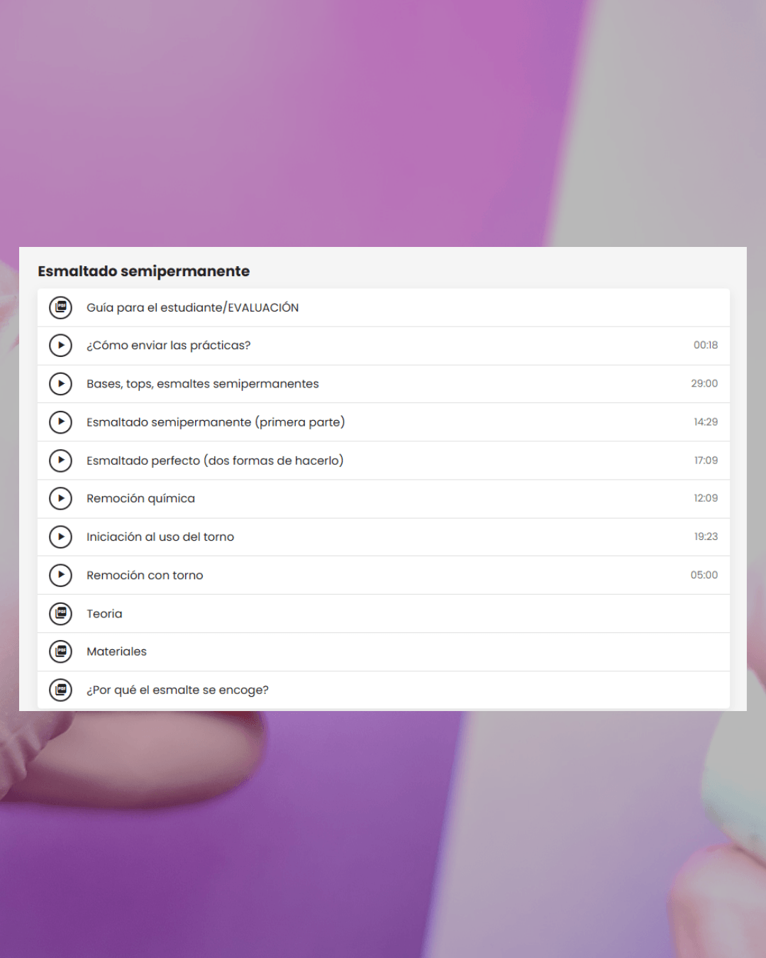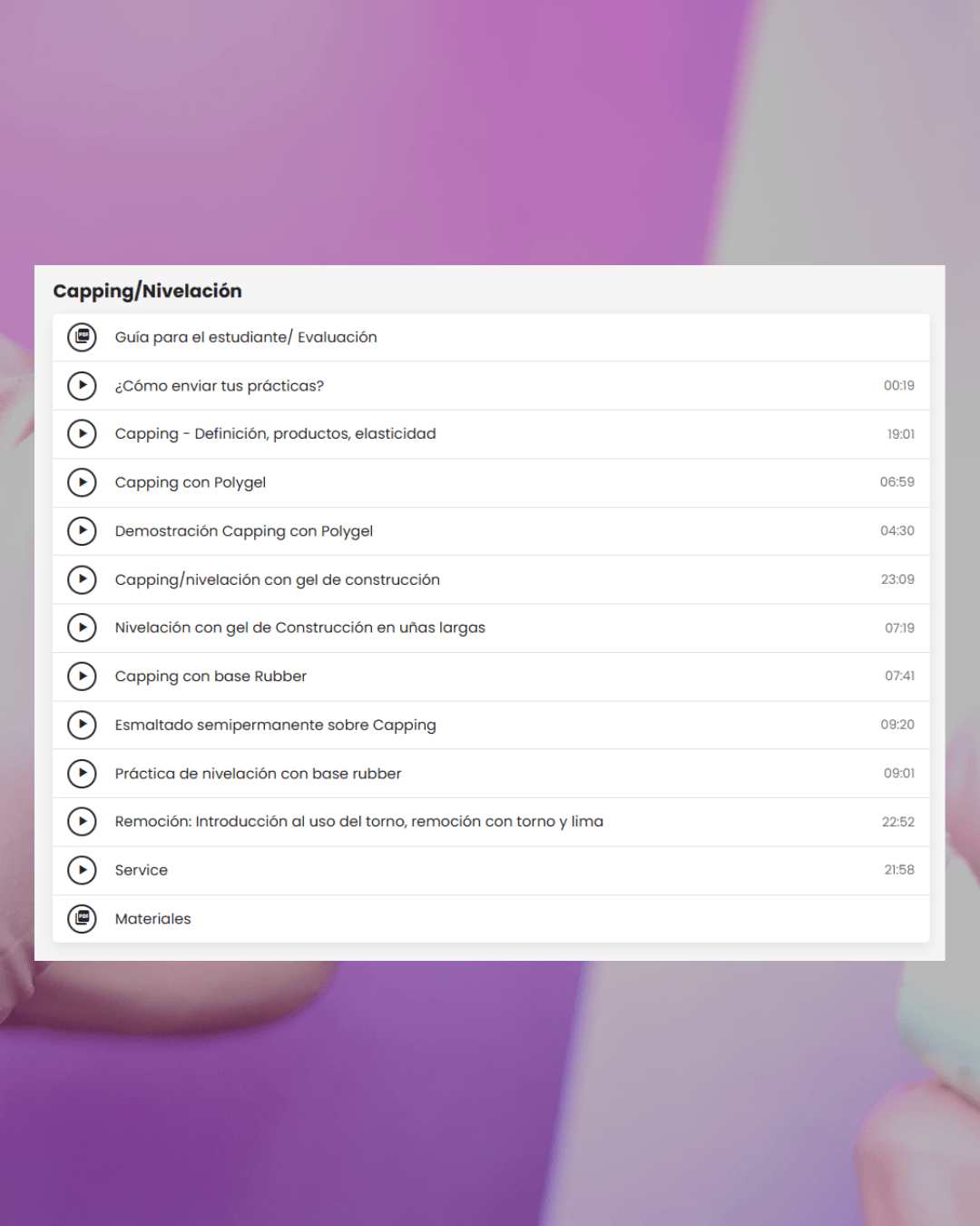 Acá empieza tu base sólida. Vas a aprender sobre anatomía de la uña, tipos de uñas, líquidos y preparadores y su uso correcto.