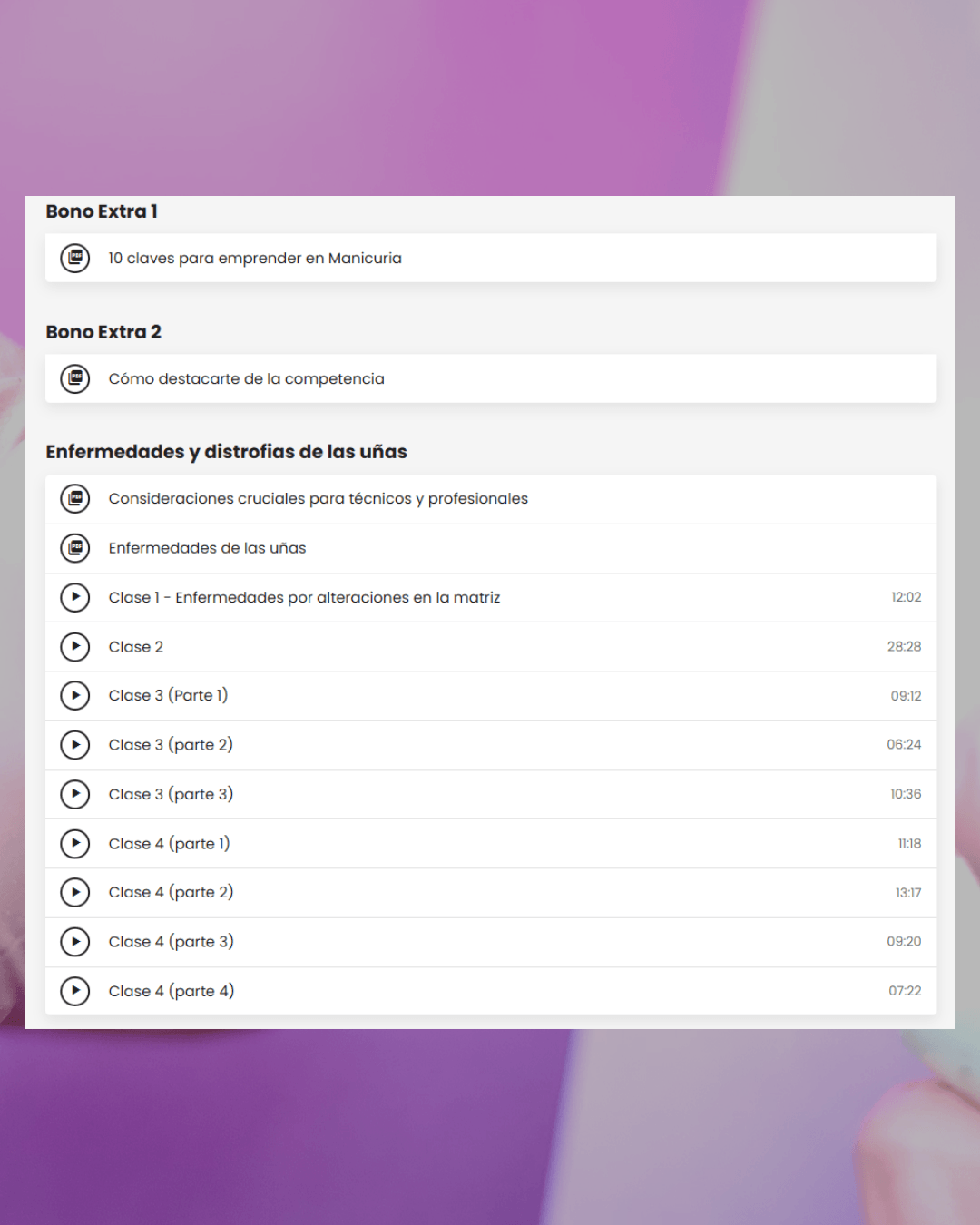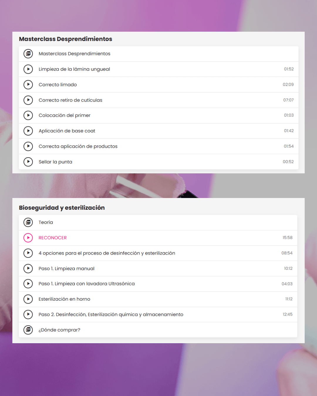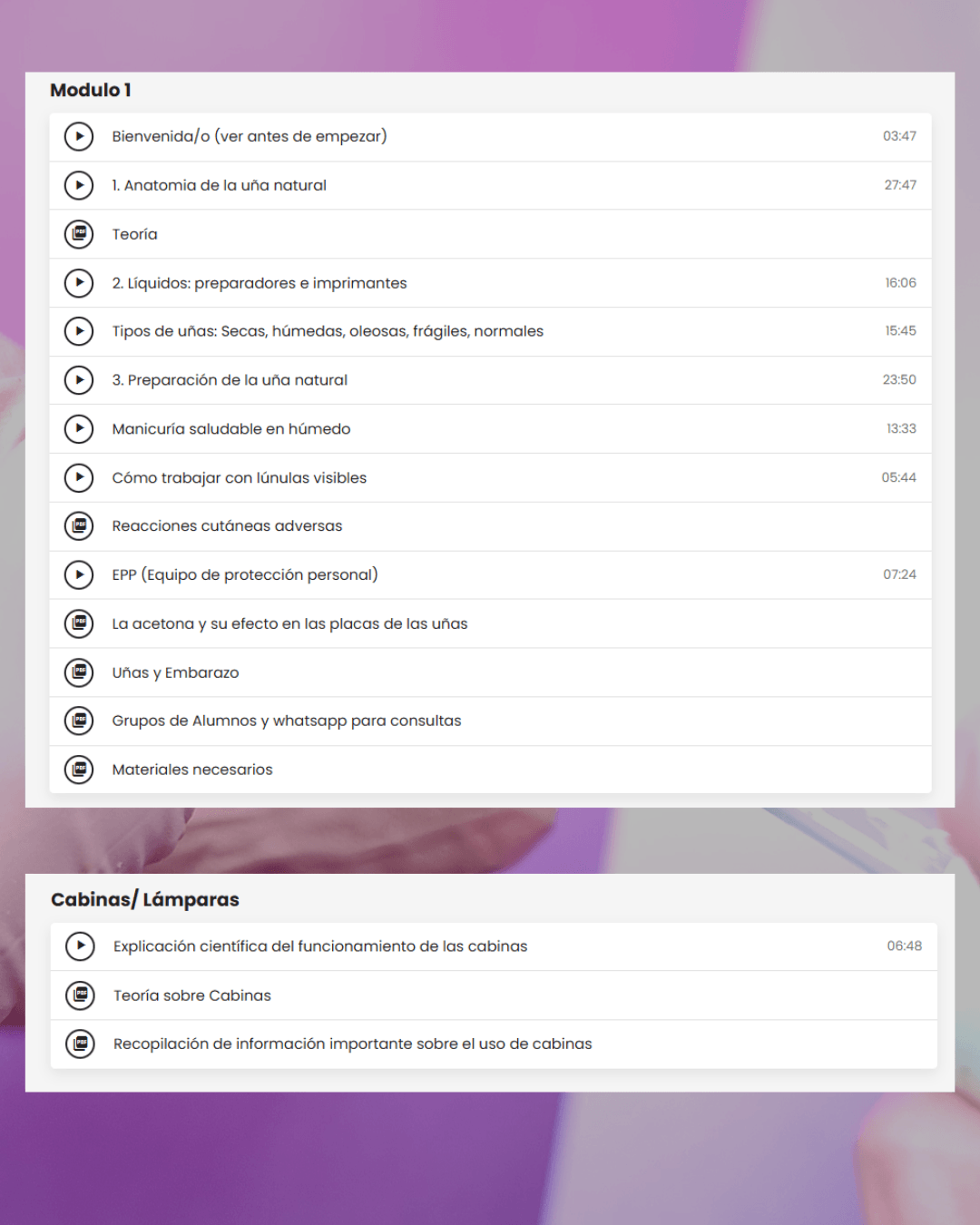 Acá empieza tu base sólida. Vas a aprender sobre anatomía de la uña, tipos de uñas, líquidos y preparadores y su uso correcto.
