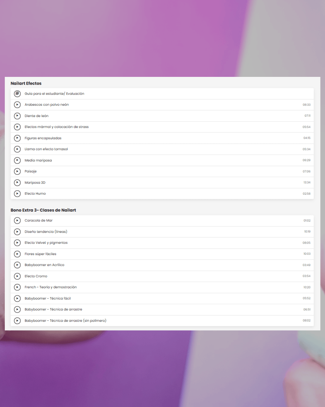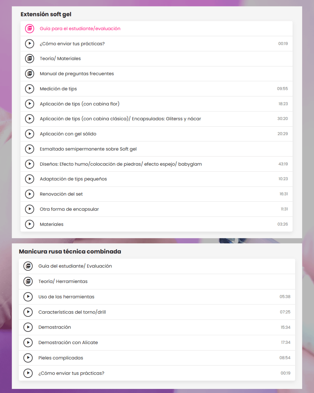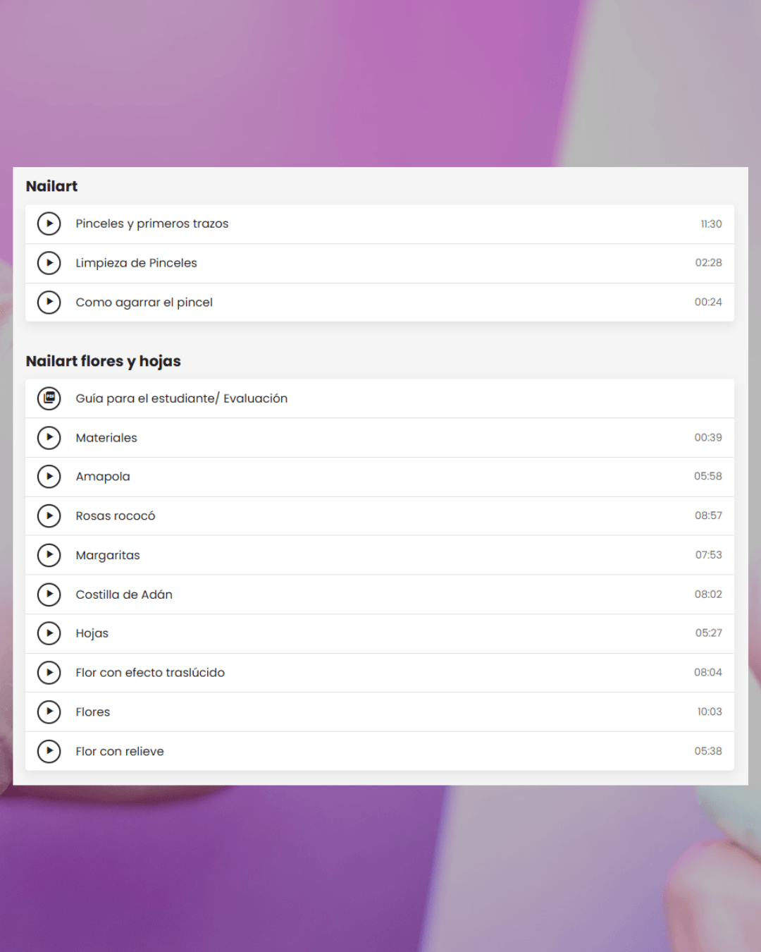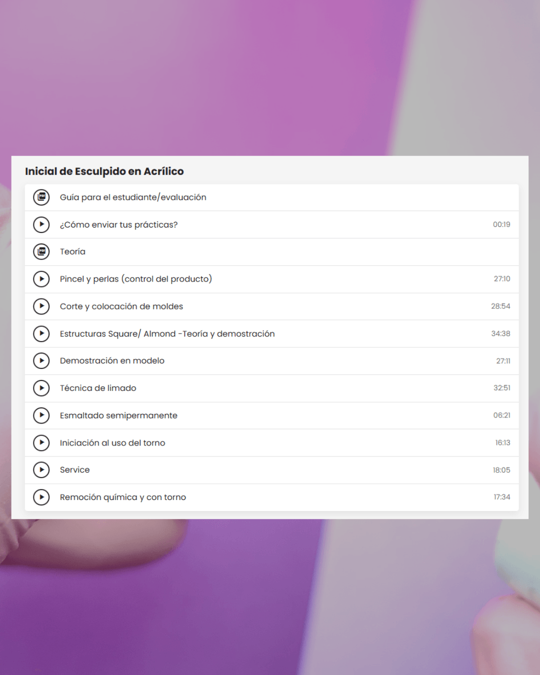 Incluye demostración práctica, explicación teórica y evaluación para obtener tu certificado de esculpido en polygel.